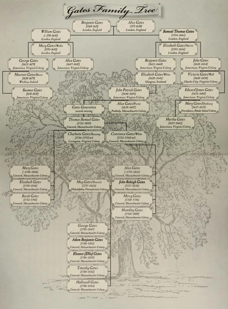 Benjamin Gates = wife │ └──────────────────────────── │ | │ Samuel Gates (c1590) William Gates (c1590) │ Unknown Gates │ Thomas Gates = wife │ Unknown Gates │ Samuel Gates │ └──────────────────────────── │ │ John Raleigh Gates Alice Gates │ └──────────────────────────── │ │ Adam Benjamin Gates Eleanor Gates │ Thomas Gates = wife │ Charles Gates = wife │ John Adams Gates = wife │ Patrick Henry Gates = Emily Appleton │ //1975 │ Benjamin Franklin Gates *1964